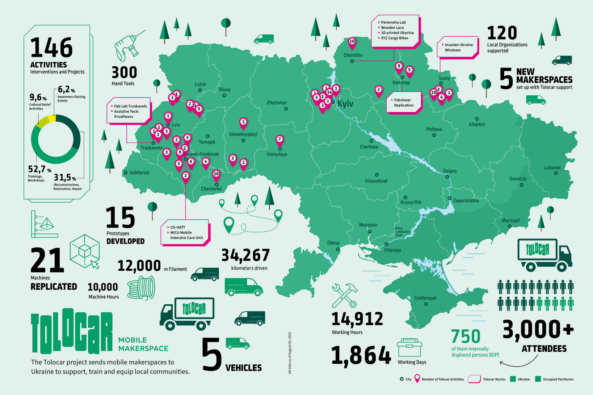 Various partners work together in different projects like reconstruction and renovation, open production, knowledge transfer and innovation to strenghten the eco-system of Ukraine. The aim is to enable communities to replicate some of the capabilities and so to catalyze rebuilding efforts and establish support networks. >>> please check: Tolocar website