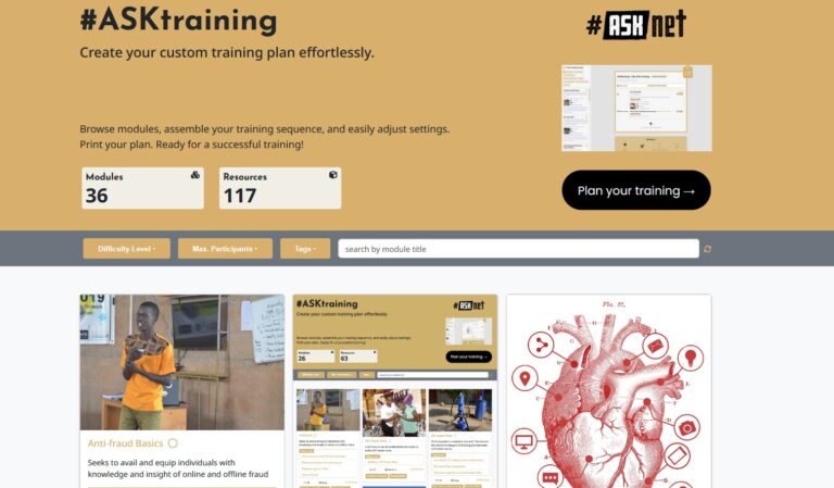 In #ASKnet, OER and platforms are living tools connecting creativity and innovation with shared purpose. Through #ASKtraining and GitHub, from repair cafés and podcast training to solar dryer projects and open guides, each hub adapts and improves materials to fit local needs, building a distributed network of community knowledge. The #ASKtraining platform is an open, adaptable, and community-driven space designed to compile, share, and streamline workshops and “how-to” guides. The #ASKnet Local Expert Action Directory (LEAD) links skilled community members in media, ICT, and technology with peers, clients, and collaborators for expertise from storytelling to programming and design. Network members use #ASKaggregator to share, amplify, and promote their community social media campaigns in real time. >>> Check the platforms!