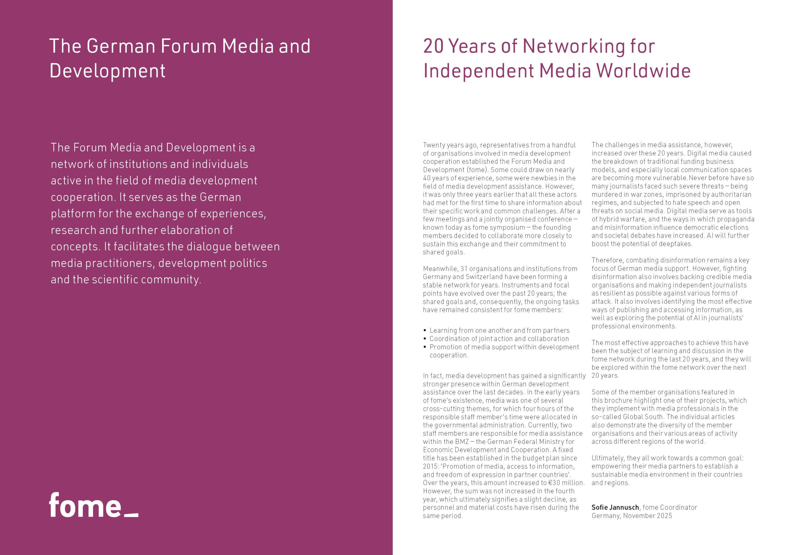 Some of the member organisations featured in this brochure highlight one of their projects, which they implement with media professionals in the so-called Global South. The individual articles also demonstrate the diversity of the member organisations and their various areas of activity across different regions of the world.